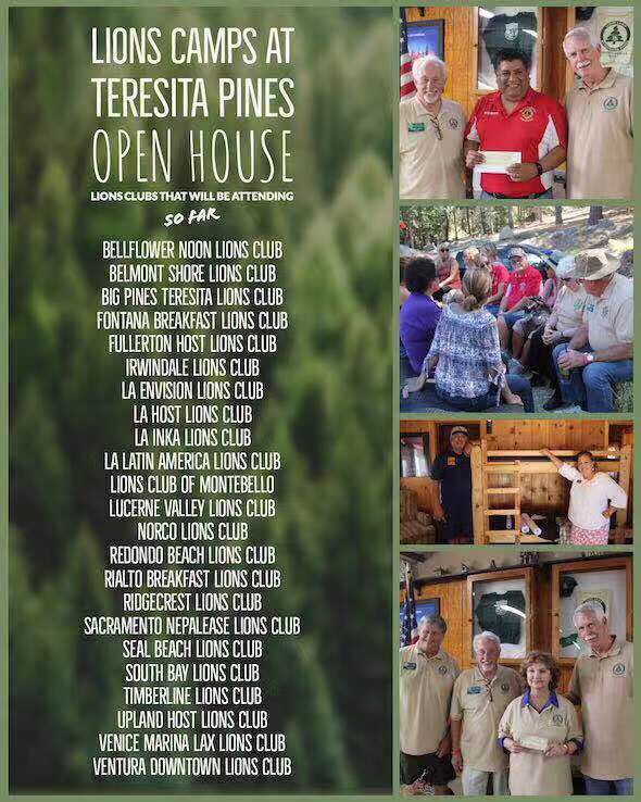 SATURDAY, SEPTEMBER 7 2019. Tersita Pines is excited to invite YOU to our Open House here at the Lions Camps at Teresita Pines, this year is special as we kick off our 25th anniversary of service to our community and making camp accessible to all regardless of disabilities.The open house is FREE and open to all ages, so please bring your children and grandchildren for a great day in the beautiful Angeles National Forest as we celebrate camp and the Lions Clubs that make it all possible.We really hope to see you here!SCHEDULE OF EVENTS9:00 AM – 10:30 AM Continental Breakfast9:00 AM – 12:00 PM Tours of facilities and camp activities12:00 PM – 1:00 PM Lunch1:00 PM – 2:00 PM Entertainment, Awards, Presentations, Raffle Winners2:00 PM – 4:00 PM Tours of facilities and camp activitiesRSVPWe ask that you please RSVP so we know how many people are attending.